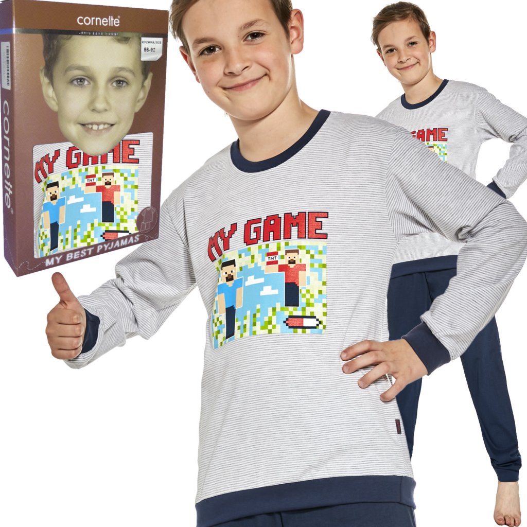 Chlapecké bavlněné pyžamo od značky Cornette. Pyžamo má tričko s dlouhým rukávem, na přední části je veselý potisk. Spodní díl je dlouhý a jednobarevný. V pase je měkká, široká guma. Rukávy i nohavice jsou ukončeny jemným úpletem