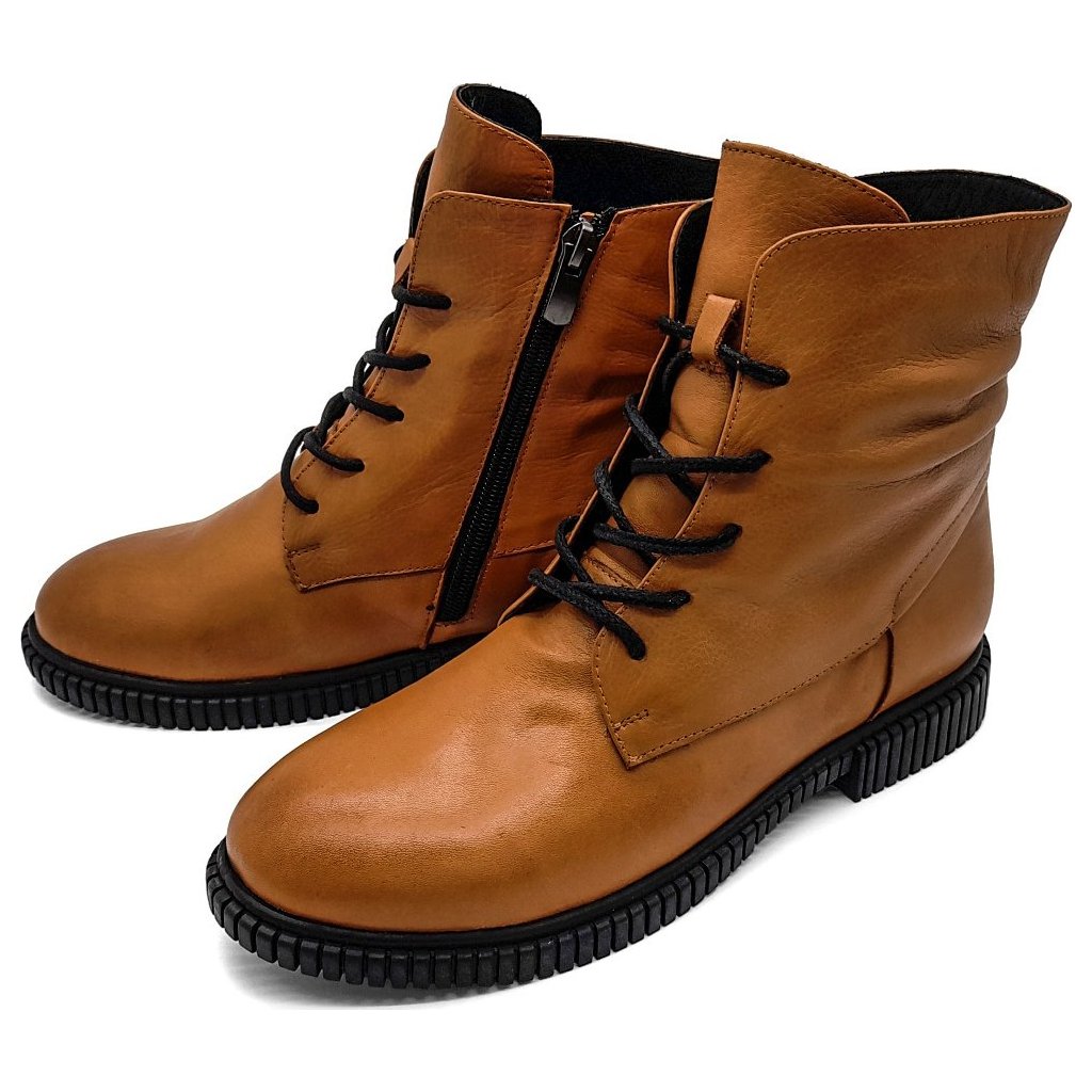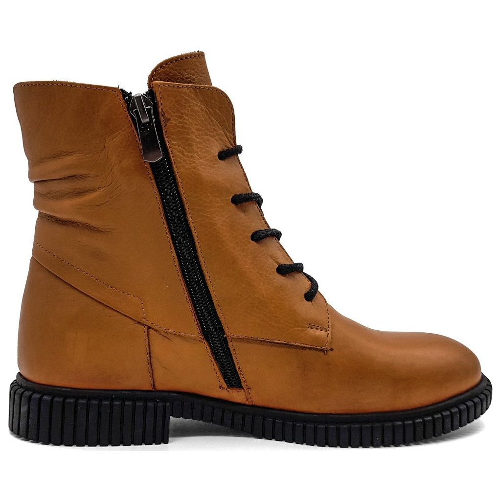 Dámské kožené kotníkové boty hnědé barvy. Nazouvání zpříjemňuje použití vnitřního zipu. Boty jsou mírně zateplené slabší vrstvou "kožíšku".