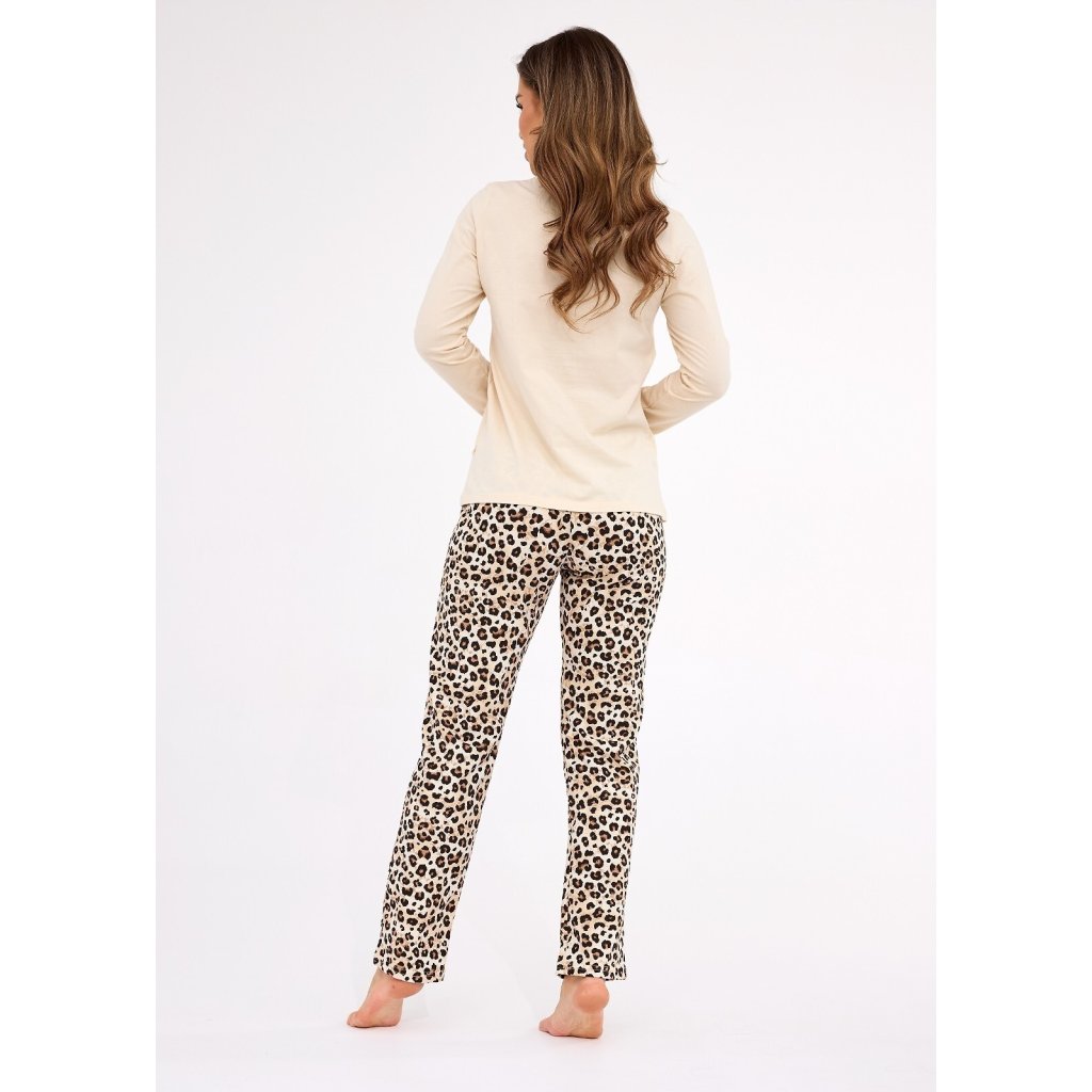 Dámské pyžamo z čisté bavlny spojuje maximální pohodlí s moderním designem. Horní díl tvoří jednoduché tričko s dlouhými rukávy a kulatým výstřihem, které zdobí decentní potisk na přední straně. Spodní díl oživují dlouhé kalhoty s výrazným leopardím vzorem, jenž dodává celku šmrnc a lehce dravý charakter. Díky pružné gumě v pase pyžamo dokonale padne a poskytuje komfort při spánku i domácím odpočinku. Příjemný bavlněný materiál zaručuje prodyšnost, měkkost a příjemný pocit na pokožce. Elegantní balení v krabičce navíc činí z tohoto pyžama také skvělý tip na dárek.