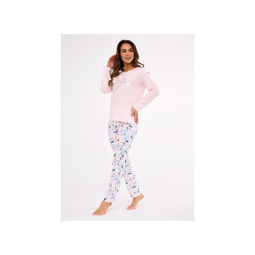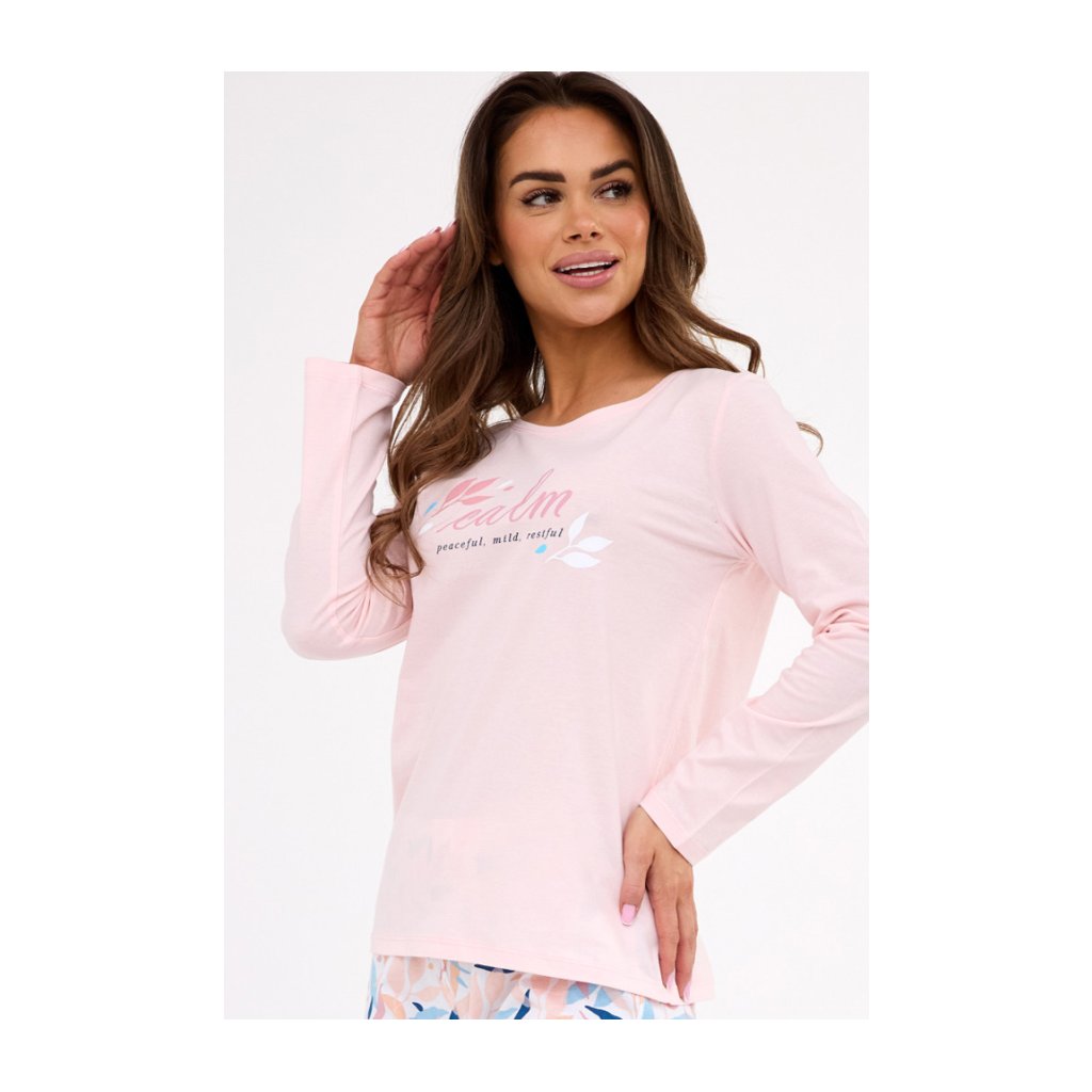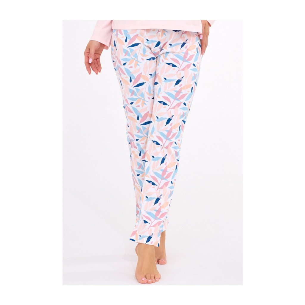 Stylové dámské pyžamo z čisté bavlny nabízí dokonalou kombinaci komfortu a elegance. Horní díl tvoří jednobarevné tričko s dlouhým rukávem, ozdobené decentním potiskem, který dodává jemný a ženský nádech. Kulatý výstřih zajišťuje pohodlné nošení a nadčasový vzhled. Spodní díl představují dlouhé kalhoty s výrazným barevným vzorem, který pyžamu propůjčuje svěží a moderní charakter. Elastický pas obšitý bavlnou zajistí volnost pohybu a perfektní přizpůsobení postavě. Díky kvalitnímu materiálu je pyžamo prodyšné, jemné k pokožce a vhodné pro každodenní nošení. Elegantní krabičkové balení z něj dělá i skvělý tip na dárek.