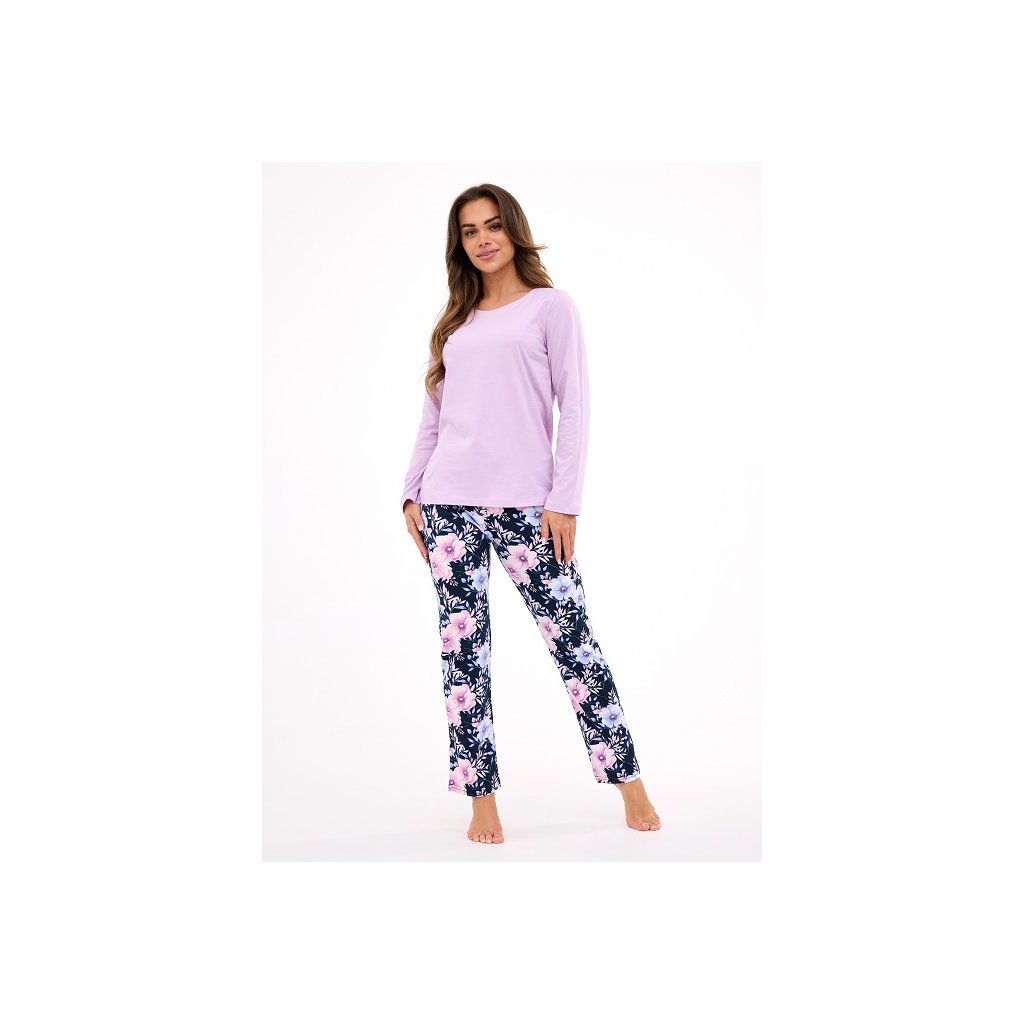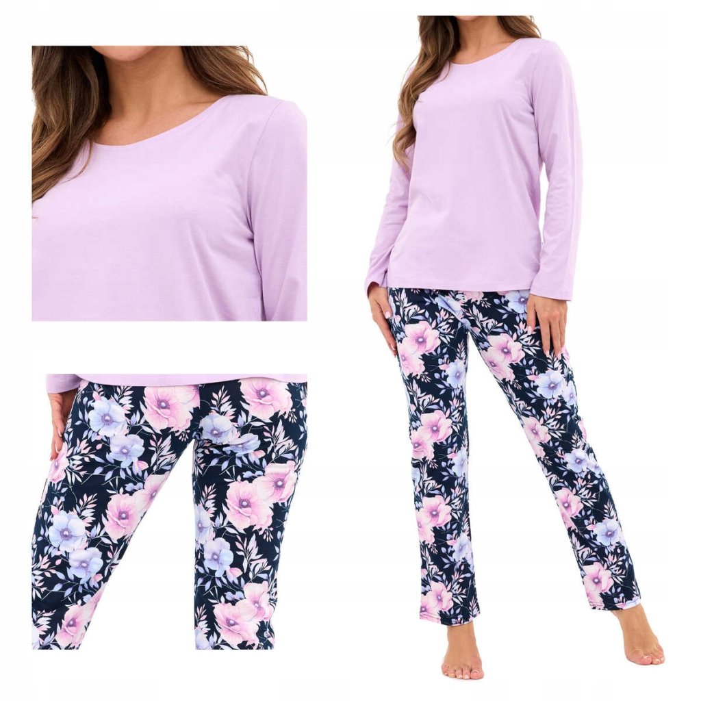 Dámské pyžamo ve dvoudílné soupravě s hladkým, jednobarevným tričkem s dlouhým rukávem a kulatým výstřihem. Kalhoty jsou dlouhé s jemným květinovým vzorem. Pyžamo je ušité z měkké a prodyšné bavlny, ideální pro pohodlný spánek i domácí nošení. Kalhoty jsou v pase do pružné obšité gumy pro větší komfort. Pyžamo je zabalené do krabičky, které může být i hezkým dárkem.